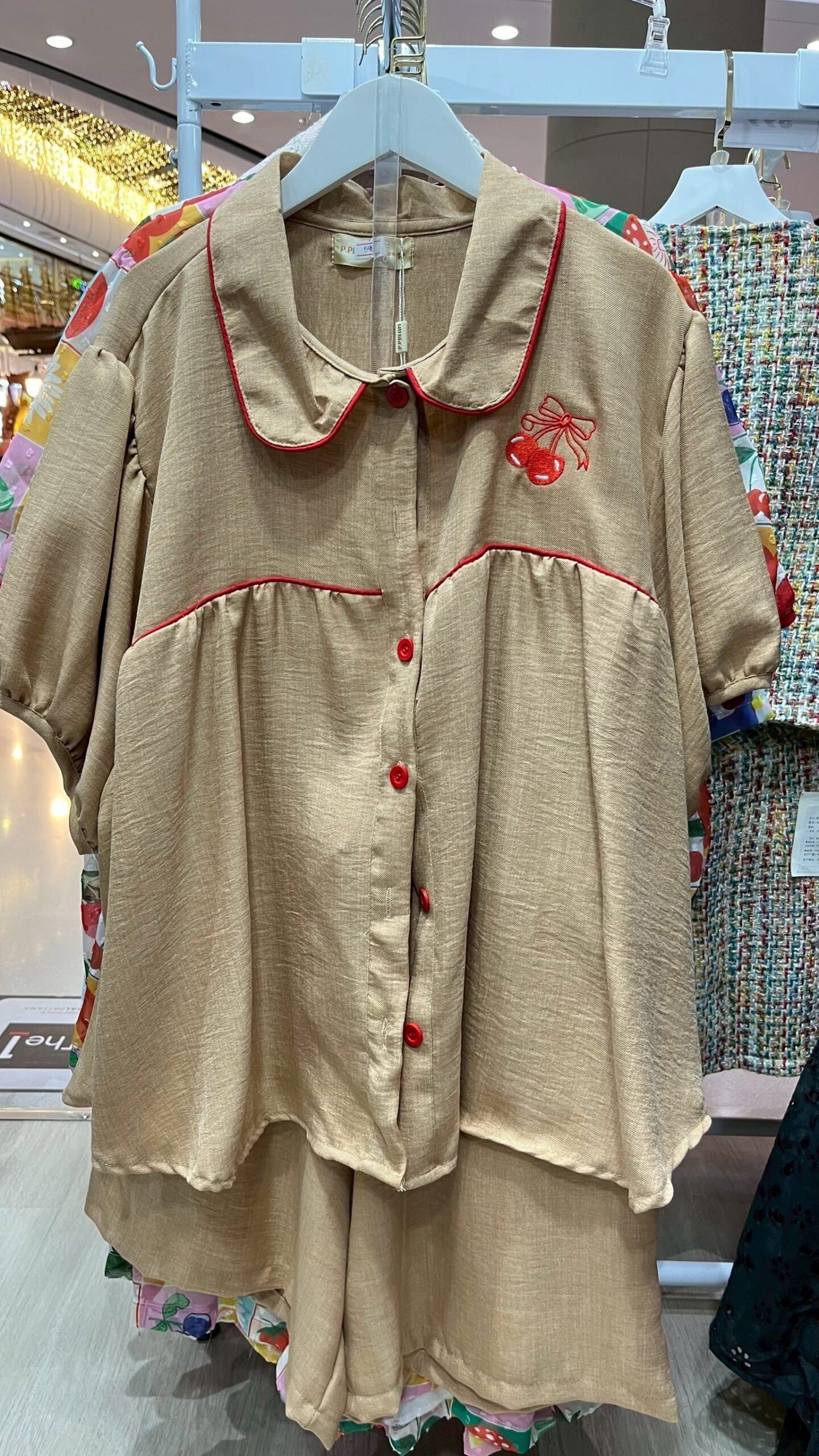 ชุดเซ็ตเสื้อ–กางเกง สีครีม เดินเส้นแดง
