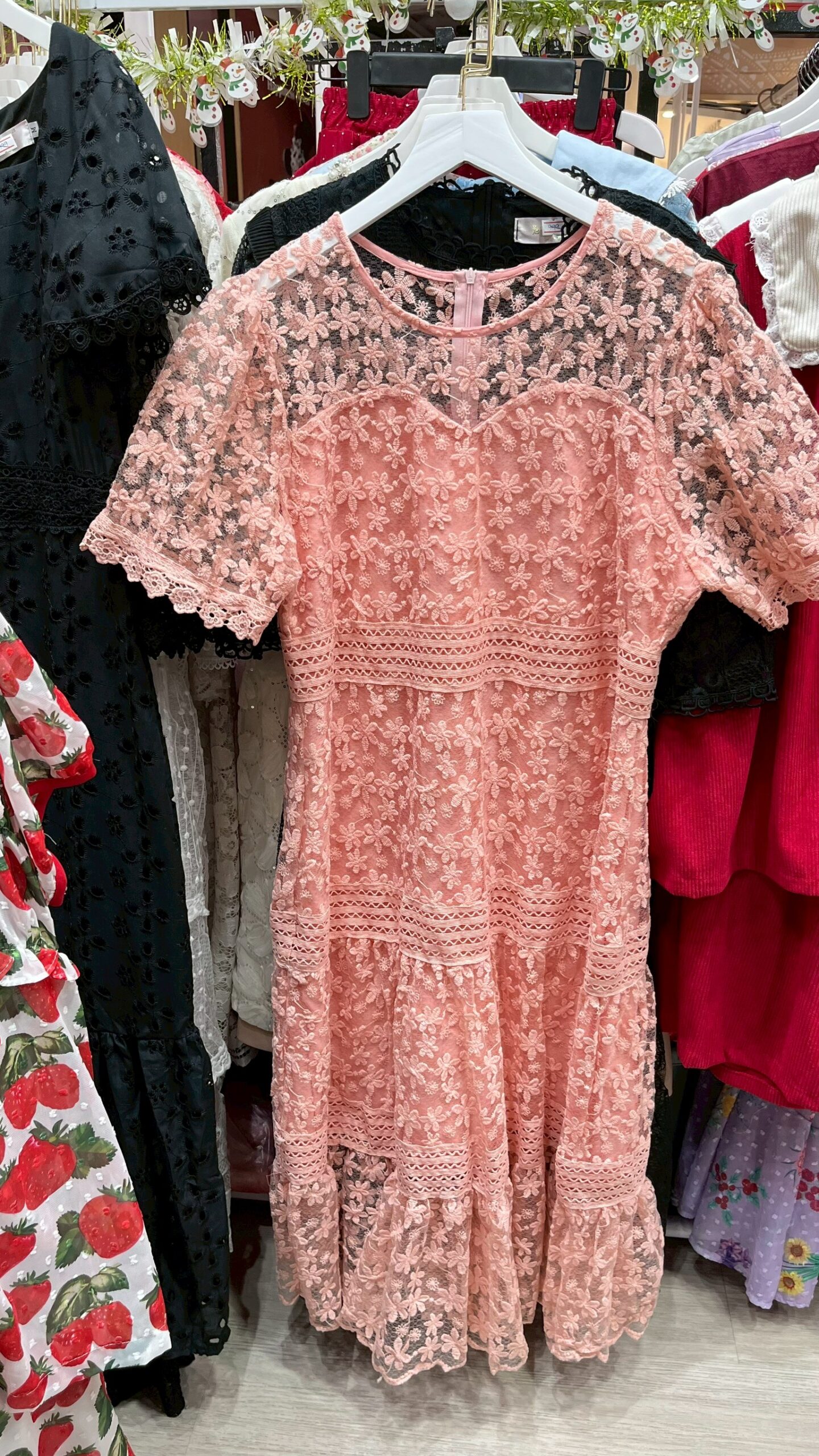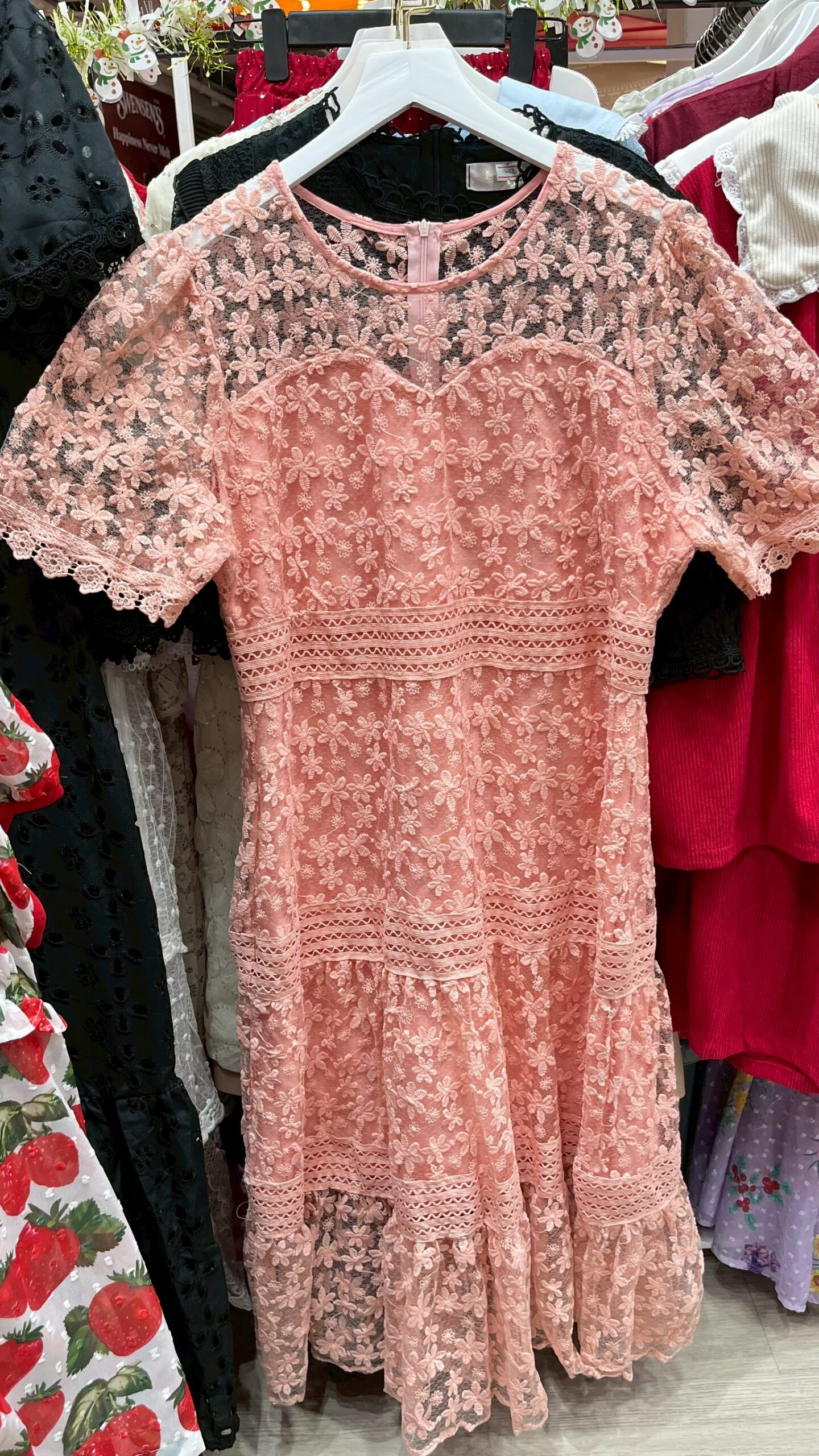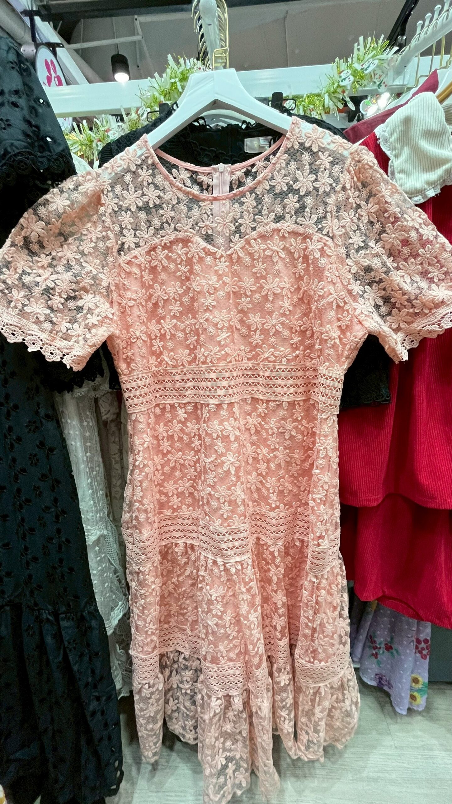 เดรสลูกไม้สีชมพู แขนสั้น