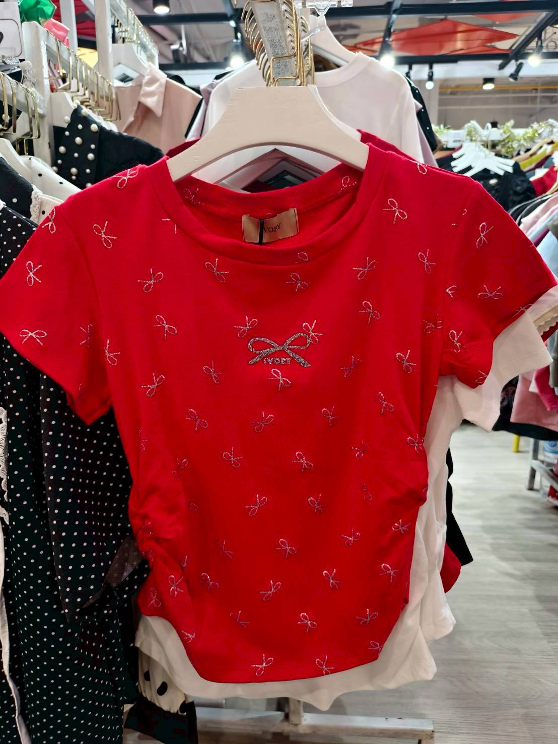 เสื้อแขนสั้นสีแดง ลายโบว์ (IVORY)